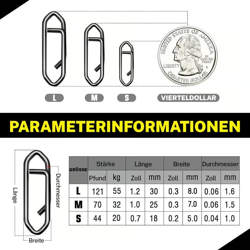 High -strength fishing clip: The fishing clip is made of high quality material. The part of the snap lock is made of stainless steel and ensures high pressure from cord or bait. The high -strength snap lock can be used for various purposes. It ensures a stable connection with their fishing connectors and not only withstands the high pressure of cord or bait, but is also strong enough to throw.